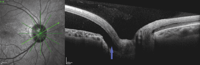 Рис. 6. ОКТ пациентки Б. Радиальный срез через центр экскавации диска зрительного нерва (стрелка — связь отслойки нейроэпителия со структурами диска зрительного нерва)