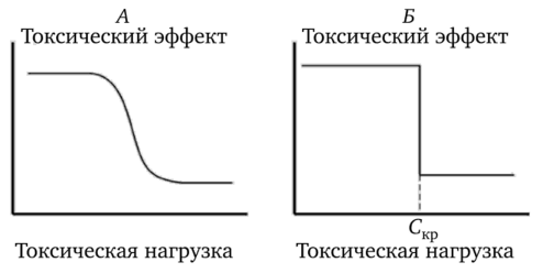 Рис. 1.1. Градированный (А) и альтернативный (Б) характер зависимости токсических эффектов от уровня токсической нагрузки