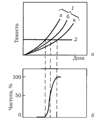 При введении низкой дозы реагируют только наиболее чувствительные особи, при повышении дозы число реагирующих растет, и при максимальной дозе эффект развивается у всех животных в группе. Существует взаимосвязь между количеством реагирующих особей и введенной дозой. При дозе 2 мг/кг реагирует 1 из 10 животных; при дозе 10 мг/кг — 5 из 10 животных. Эта зависимость частоты развития эффекта и дозы является результатом различной чувствительности особей, для которой, как правило, характерно логарифмически нормальное распределение.