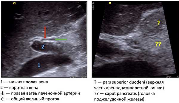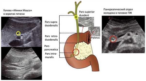 На рис. 6 на эхограмме 1 видна голова «Микки Мауса»: в воротах печени — уши (правое — общий желчный проток или в некоторых случаях общий печеночный проток, левое — собственная печеночная артерия), голова — воротная вена, туловище — нижняя полая вена. Желтым цветом показана супрадуоденальная часть общего желчного протока на эхограмме и на схеме [12].