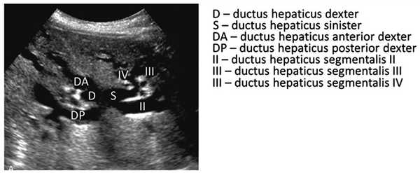 У здорового человека внутрипеченочные протоки ductus hepaticus dexter (правый печеночный проток) и ductus hepaticus sinister (левый печеночный проток) (рис. 1) не видны при ультразвуковом исследовании, виден при хорошей визуализации только ductus hepaticus communis (общий печеночный проток). Он соединяется с ductus cysticus (пузырный проток) и образуется ductus choledochus (общий желчный проток), который в норме имеет длину 5—7 см [4].