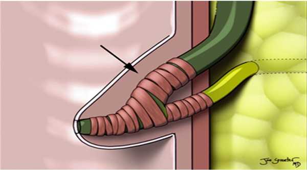 Парасагиттальный доступ (см. рис. 5): общий желчный проток и гастродуоденальная артерия направлены под острым углом друг к другу (зеленым цветом обозначен общий желчный проток, красным — гастродуоденальная артерия).