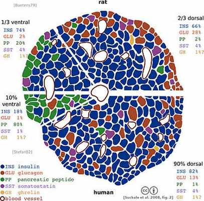 Данная диаграмма демонстрирует структурные различия между панкреатическими островками крысы (вверху) и человека (внизу) pars ventralis pancreas — слева; pars dorsalis — справа. Клетки островков окрашены по-разному: альфа-клетки — красным, бета-клетки — синим, дельта-клетки — фиолетовым, PP-клетки — зелёным, эпсилон-клетки — жёлтым. Бета-клетки грызуна, в отличие от человека сгруппированы в характерное инсулиновое ядро.