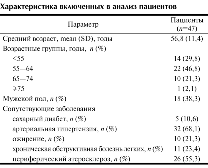 Среди оперированных по поводу опухоли сердца преобладали женщины (61,7%), 46,8% больных были в возрасте от 55 до 64 лет (см. таблицу). Среди сопутствующих заболеваний преобладали артериальная гипертензия (АГ), которая была у 68,1% пациентов и периферический атеросклероз - у 55,3%. Отмечена большая частота хронической сердечной недостаточности (ХСН) - у 78,7% больных как проявление основного заболевания и сопутствующая патология (см. таблицу). У большинства пациентов ХСН соответствовала I-II функциональному классу (ФК).