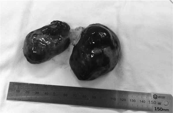 Рис. 4. Макропрепарат удаленной опухоли сердца пациента А., 60 лет, миксома обоих предсердий.