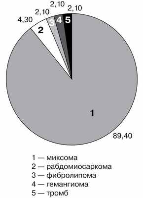 Миксома составляет 30-50 % от всех случаев. Наиболее распространена у женщин старше 40 лет и у мужчин молодого возраста.