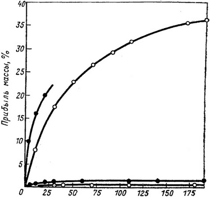 Рис. 81. Скорость окисления калоризованного (нижние 2 кривые) и некалоризованного (верхние 2 кривые) железа. Точками обозначена температура 1000° С, кружочками 800° C