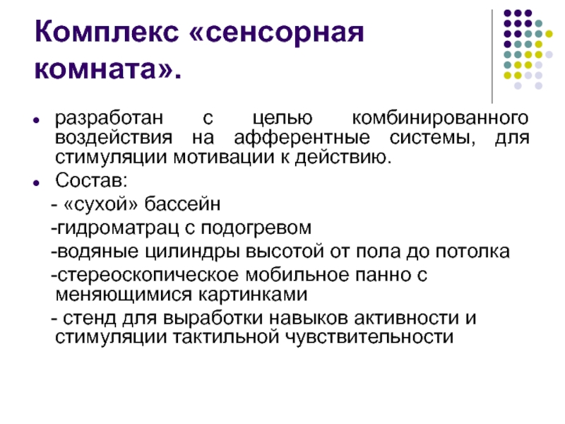 Положительное влияние на развитие двигательных функций оказывает использование комплексных афферентных стимулов: зрительных (большинство упражнений проводится перед зеркалом), тактильных (поглаживание конечностей; опора ног и рук на поверхность, покрытую различными видами материи, что усиливает тактильные ощущения; ходьба босиком по песку и так далее)