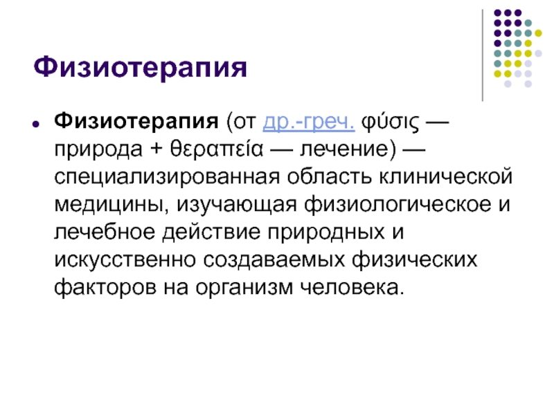 Физиотерапия (от др.-греч. φύσις — природа + θεραπεία — лечение) — специализированная область клинической медицины, изучающая физиологическое и лечебное действие природных и искусственно создаваемых физических факторов на организм человека.