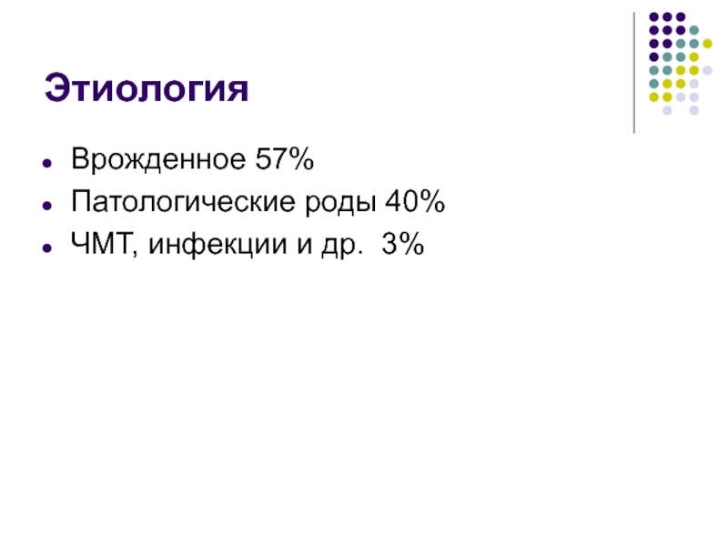 Недоношенность или переношенность плода. Во время родов: - акушерский травматизм - затяжные роды с обвитием пуповиныВ первый год жизни: - инфекции, осложненные энцефалитом - после ушибов головы