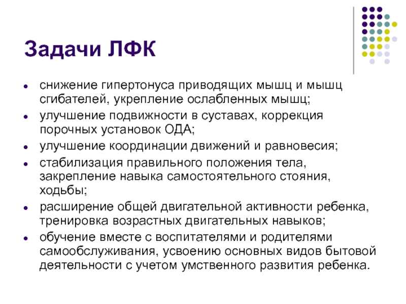 снижение гипертонуса приводящих мышц и мышц сгибателей, укрепление ослабленных мышц;