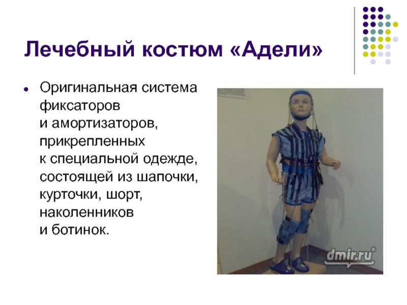 Оригинальная система фиксаторов и амортизаторов, прикрепленных к специальной одежде, состоящей из шапочки, курточки, шорт, наколенников и ботинок.