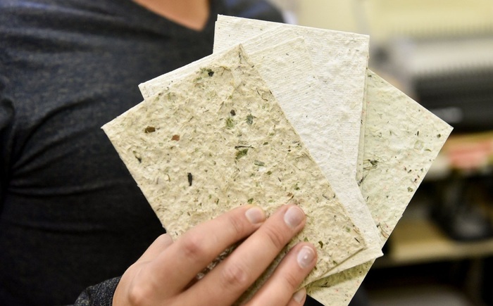 В бумажной мастерской делают крафтовую бумагу, а из нее — блокноты, открытки, записные книжки, подарочные конверты. Бумагу делают из разной макулатуры и добавляют в нее сухие листья и цветы.