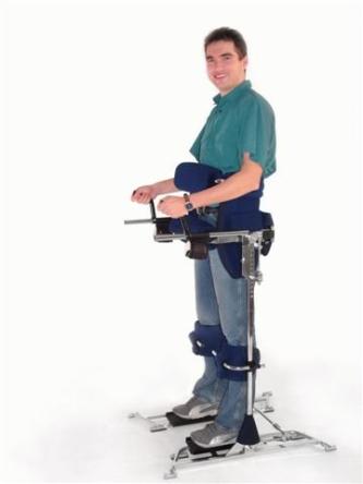Положение стоя в параподиуме. Параподиум делает возможным самостоятельное, удобное и полностью безопасное пребывание в позиции стоя ( без участия рук ) в течении очень длительного времени.Даже при обмороке человек остается в вертикальной позиции благодаря постоянному контролю над центром тяжести пациента. Для особенно легких лиц рекомендуется использование ремня спереди или сзади или оба ремня одновременно.