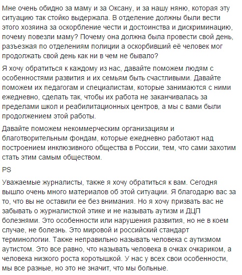 - Ситуация, которая вчера произошла с моей родной сестрой Оксаной, не единичный случай, к сожалению, это та реальность, в которой живут все семьи, воспитывающие детей с особенностями развития, - написала на своей странице в Facebook Наталья Водянова. - Мне тяжело об этом говорить, но, я понимаю, что это сигнал для общества, который невозможно не услышать. Мне очень обидно за маму и за Оксану, и за нашу няню, которая эту ситуацию так стойко выдержала.