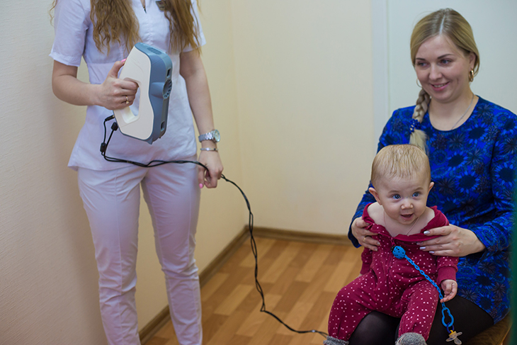 Мы используем один из самых современных и высокоточных сканеров. Процедура сканирования данным сканером абсолютно безвредная. Сканер не имеет какого-либо излучения. Работа данного сканера основана на безопасной технологии структурированного света. Во время санирования ребёнок спокойно сидит либо у мамы на руках, либо в детском стульчике. Данный сканер широко используется европейскими клиниками, занимающимися лечением деформаций головы у детей. Сканер сертифицирован. На основании данных сканирования мы проводим оценку формы головы с измерением показателей для определения степени деформации.