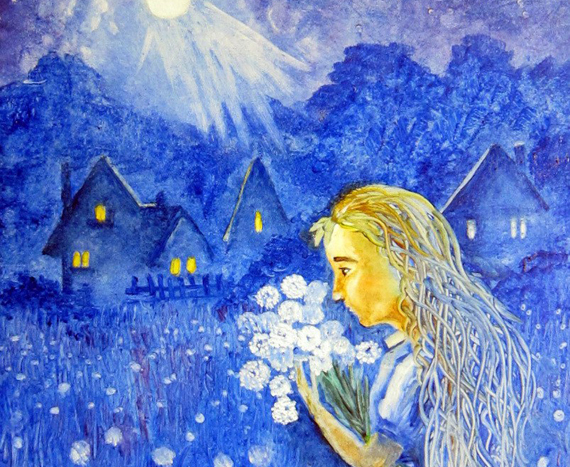 Девочка с желтыми волосами прижимает к себе охапку одуванчиков, они похожи на пух, кругом все синее-синее, и белая луна отбрасывает лучи, похожие на ангельские крылья.