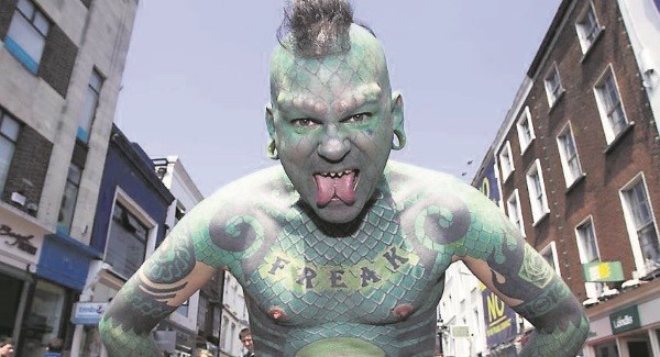 Затем последовала череда многочисленных татуировок. Чтобы уподобиться ящерице, Спрэг прибегнул к помощи пластических хирургов, которые ввели ему в область каждой из бровей по пять тефлоновых имплантатов, имитирующих морду рептилии.