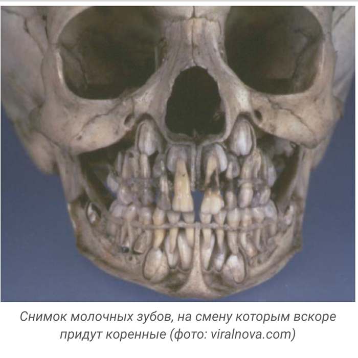 В этот период череп ребенка с молочными зубами и новорастущими под ними, по большей части состоит из двойного зубного ряда.