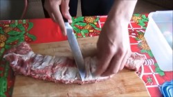 В магазинах продают готовые ребрышки, которые можно сразу мариновать и коптить, нарезав их на кусочки по 2-3 ребра. При наличии свиной грудинки потребуется самостоятельно подготовить сырье. Потребуется отделить ровную реберную полосу, аккуратно отрезав грудинку. Использовать необходимо острый нож, чтобы надрезы были красивыми, а хрящи легко перерезались. Заготовка очищается, срезается пленка. Лишний жир обрезается. Для копчения холодным методом это делать не обязательно, поскольку жир усохнет. При приготовлении в домашних условиях в коптильне горячего копчения жир будет стекать и отрицательно сказываться на дымообразовании. Очищенный кусок разрезается на части по 2-3 ребра. Такой размер оптимален для полноценного маринования и быстрого копчения.