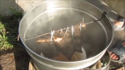 Процесс копчения можно проводить как в импровизированной, так и в специально предназначенной для этого коптильне с использованием ольховых опилок. На нашем видео показан процесс копчения в нержавеющей кастрюле.