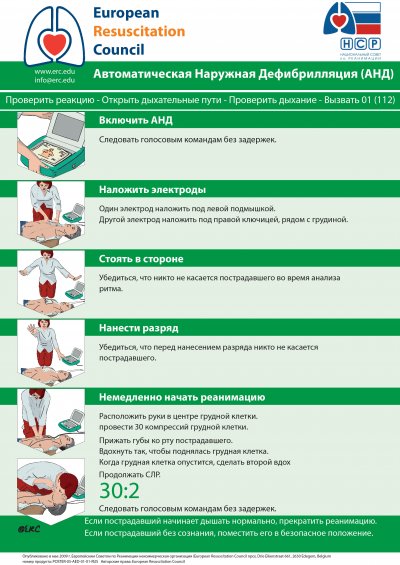 Главной задачей при оказании помощи является восстановления дыхания, сердечного ритма и запуска системы кровообращения, так как с кровью в клетки и ткани поступает кислород, без которого невозможно существование жизненно-важных органов, особенно мозга. Перед тем как оказывать помощь, необходимо убедится, что человек без сознания. Потормошите пострадавшего, постарайтесь громко окликнуть его. Если ничего не получилось, стоит оказать первую помощь, которая включает в себя несколько основных этапов. Первым делом необходимо уложить больного на твердую поверхность и запрокинуть ему голову. После этого освободить дыхательные пути от инородных тел и слизи. Следующим шагом является искусственная вентиляция легких (изо рта в рот или нос) Непрямой (наружный) массаж сердца. Перед тем, как приступать к данному этапу необходимо выполнить 'прекардиальный удар' - бить следует кулаком в среднюю часть грудины. Главное, чтобы удар был не прямо в область сердца, так как это может усугубить положение пострадавшего. Прекардиальный удар помогает сразу реанимировать больного или же увеличивает эффект массажа сердца. После подготовительной процедуры, если больного не удалось реанимировать, приступают к наружному массажу. Каждые две-три минуты, необходимо проверять состояние пострадавшего - пульс, дыхание, зрачки. Как только появилось дыхание, можно прекращать реанимацию, однако если появился только пульс, требуется продолжить искусственную вентиляцию легких. Массаж сердца необходимо делать до тех пор, пока окраска кожи не начнет приобретать нормальный, естественный цвет. Если вернуть к жизни больного не удается, то прекращать помощь можно только тогда, когда прибыл врач, который и может дать разрешение о прекращении реанимации. Важно помнить, что данные мероприятия только начальный этап помощи пострадавшему, которую необходимо сделать до приезда врачей. Врачи скорой помощи для дальнейшего поддержания жизни пострадавшего используют специальные методы. Главной задачей врачей является восстановление дыхания больного. Для этого используют вентиляцию маской. Если данный метод не помогает или невозможно его использование, то прибегают к инкубации трахеи - данный способ является наиболее эффективным по обеспечению проходимости дыхательных путей. Однако выполнить установку трубки в трахею может, только специалист. Для запуска сердца врачи используют дефибриллятор - прибор, который воздействует электрическим током на сердечную мышцу. На помощь врачам также приходят специальные медицинские препараты. Основными являются: Атропин - используют при асистолии. Эпинефрин (адреналин) - необходим чтобы усилить и увеличить частоту сердечных сокращений. Бикарбонат натрия - его часто используют при продолжительной остановке, особенно в тех случаях, когда остановка сердца была вызвана ацидозом или гиперкалиемией. Лидокаин , амиодарон и бретилия тозилат - являются анитиаритмическими препаратами. Сульфат магния помогает стабилизировать клетки сердца и стимулирует их возбуждение Кальций применяют при гиперкалиемии. ПРИЧИНЫ ОСТАНОВКИ СЕРДЦА Выделяют несколько основных причин остановки сердца Первое место занимает фибрилляция желудочков. В 70-90% случаев именно данная причина является следствием остановки сердца. Мышечные волокна, из которых со
