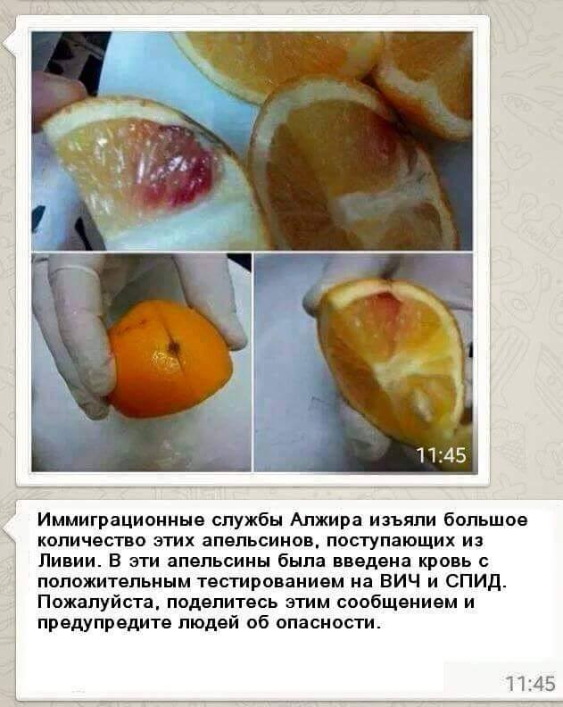 Страшилкой недели стала новость про зараженные ВИЧ-инфекцией апельсины из Ливии – утку рассылали людям на сотовые телефоны и запустили в социальные сети.Казахстанцы стали получать по WhatsApp фотографии с сообщениями, в которых говорится, что “иммиграционные службы Алжира изъяли партию апельсинов, которые могут быть напичканы кровью больных людей”. Фото “кровавых” апельсинов выглядели очень убедительно, и люди перестали