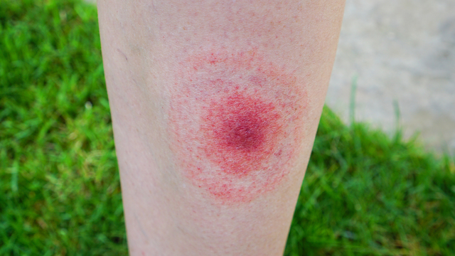 Местные симптомы выглядят следующим образом: в месте укуса клеща появляется болезненность, припухлость, зуд, покраснение. Образуется так называемая кольцевидная эритема – специфический симптом клещевого боррелиоза. Выявляется у 70% больных. В месте укуса появляется красное плотное образование – папула, которая постепенно за несколько дней расширяется в стороны, приобретая форму кольца. В центре остается место укуса несколько более бледного цвета, а ободок имеет более насыщенный красный цвет, приподнимается над непораженной кожей. В целом зона покраснения имеет овальную или округлую форму с диаметром 10-60 см. Иногда внутри кольца могут образовываться более мелкие колечки, особенно если размер эритемы большой. Довольно часто эритема не доставляет больному неприятных ощущений, но бывает, что это место чешется, печет. Бывает, что кольцевидная эритема становится первым проявлением заболевания и не сопровождается общими реакциями. Возможно появление дополнительных кольцевидных эритем, вторичных, т. е. в местах, где не было укусов.