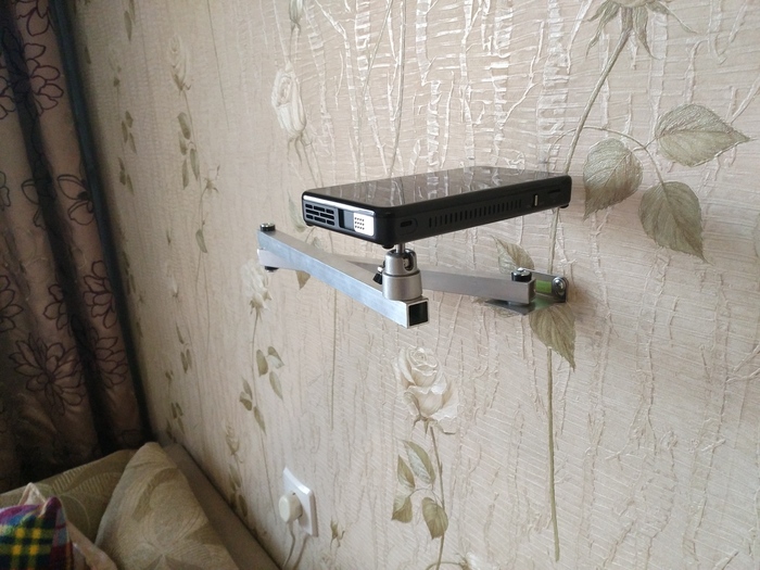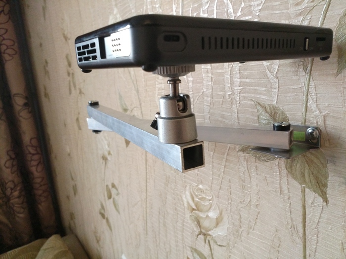 Крепится к стене на самодельном кронштейне из разрезанной на 2 части алюминиевой прямоугольной трубки и скреплённые длинными винтами с пластиковыми шайбами. Сам проектор крепится на головку со штатива из комплекта проектора. Кронштейн получился с большими регулировками.