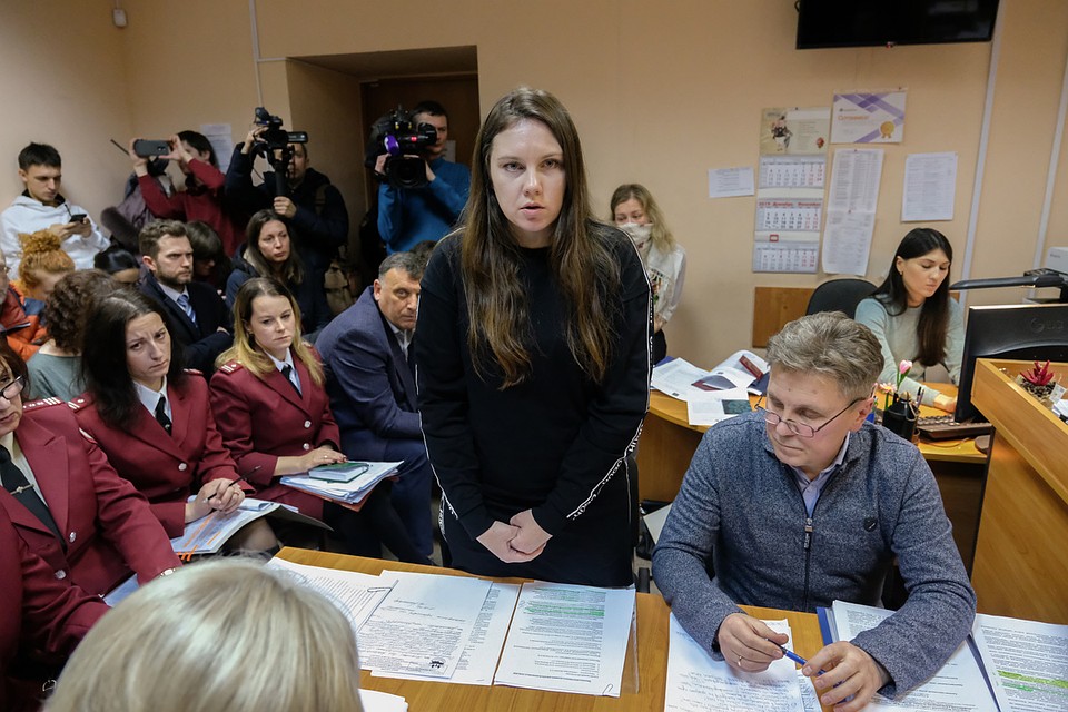 Алла Ильина, которая самовольно покинула инфекционную больницу имени С. П. Боткина после возвращения из Китая, и ее адвокат Виталий Черкасов перед заседанием Петроградского районного суда Фото: Артем КИЛЬКИН