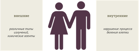 Причин нарушения генетического материала человека, приводящего к ошибкам в развитии, существует великое множество. Это могут быть как внешние факторы (например, различные типы излучений, химические агенты), так и внутренние (например, нарушение процесса деления клетки). Эти факторы могут затрагивать разные уровни организации генетического материала: гены; отдельные хромосомы; хромосомный набор в целом.