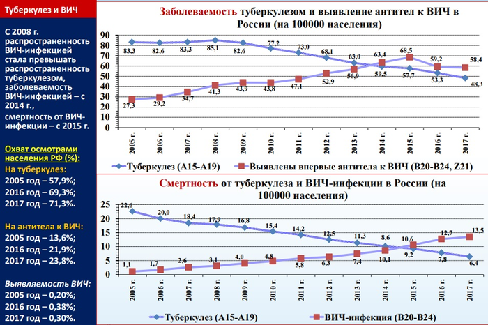 Высокий процент смертности при туберкулезе и ВИЧ обычно связан не с малоэффективностью противотуберкулезной или антиретровирусной терапии, а с тяжелым течением всех сопутствующих диагнозов при ВИЧ.