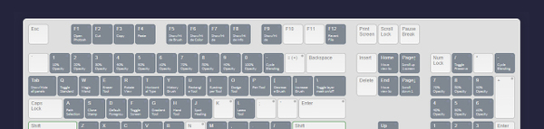 Если вы обнаружите, что текст на виртуальной клавиатуре сложно читать, не проблема, просто наведите курсор на любую клавишу. Название команды или инструмента, за вызов которых отвечает горячая клавиша, при наведении курсора отобразится крупным шрифтом ниже виртуальной клавиатуры.