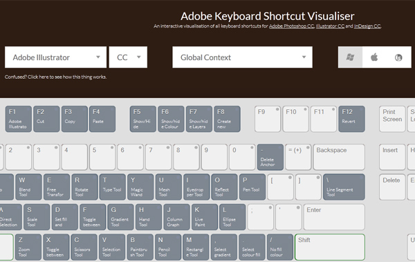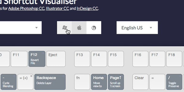Adobe Keyboard Shortcut Visualizer создаёт в веб-браузере виртуальную клавиатуру, на которой отображаются более 1000 горячих клавиш для приложений Photoshop, Illustrator и InDesign.