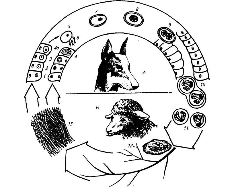 А — развитие в кишечнике собак; Б — развитие в организме овец; 1—4 — развитие микрогаметы; 4а — развитие макрогаметы; 5 — макрогамета; б — микрогаметы; 7—9 — спорогония; 10 — спорулированная ооциста; И — спороцисты, освободившиеся из ооцисты; 12 — меронты в кровеносных сосудах; 13 — циста в мышцах промежуточного хозяина