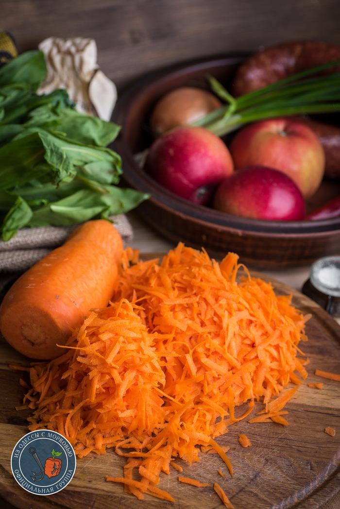 К вышеупомянутой колбасе такой гарнир подходит с трудом. Но так как я большой любитель сочетания яблока и моркови, то решил забить на это дело и все же приготовить.