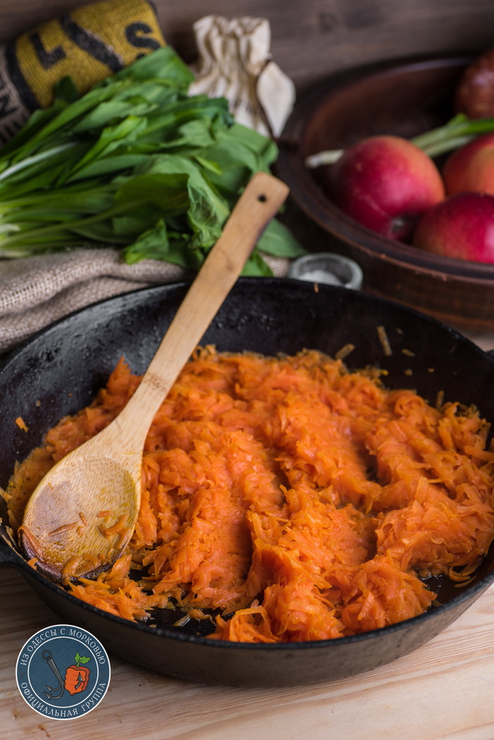 - Забросить лук к моркови, прямо в сковороду (или в казан, если вы запасливая белка) натереть яблоко на крупной терке. Яблоко можно и не чистить. Перемешать и готовить, помешивая, до готовности. Жидкость должна полностью выпариться, а морковь с яблоком стать полностью мягкими.