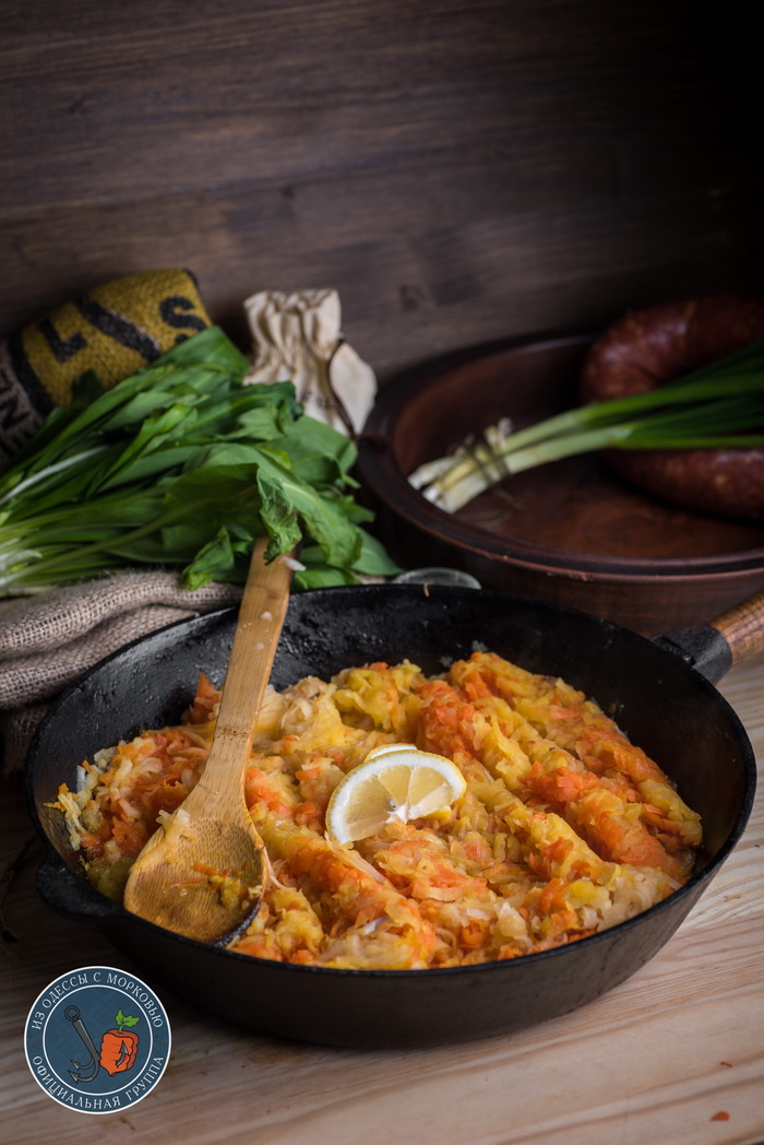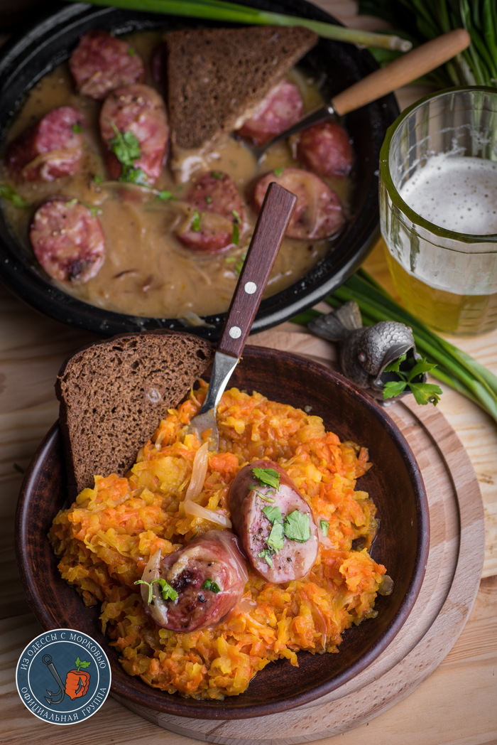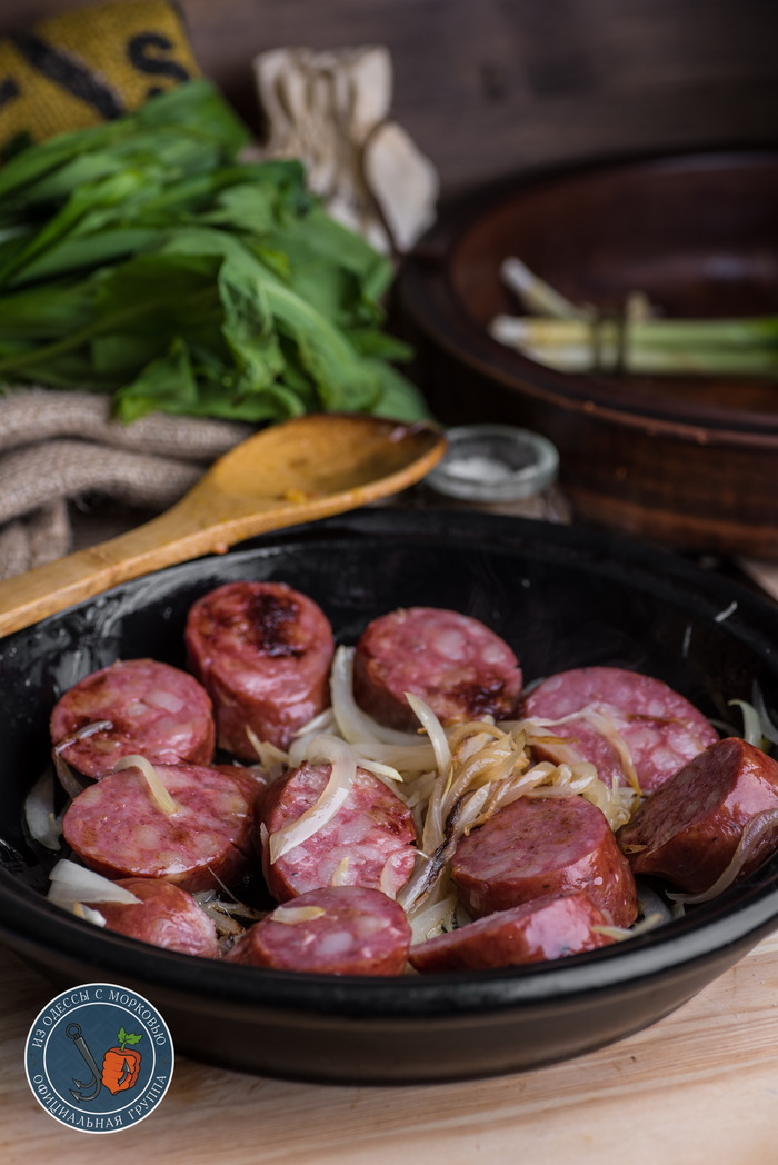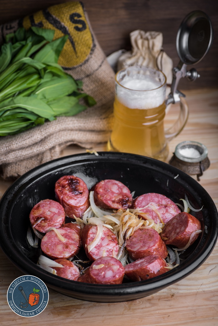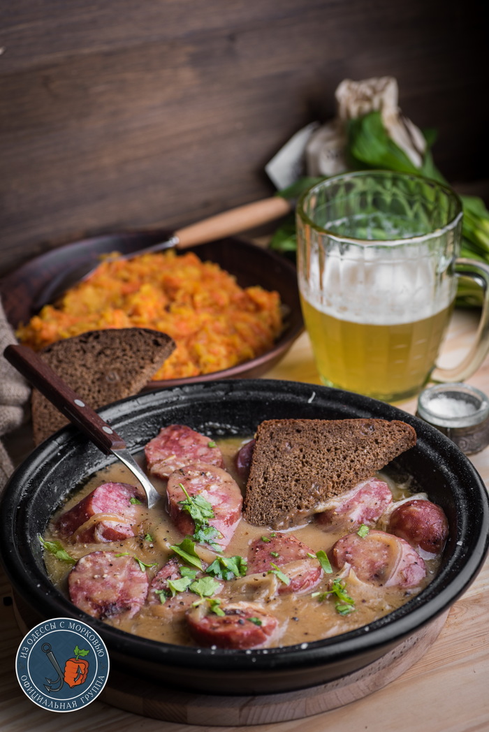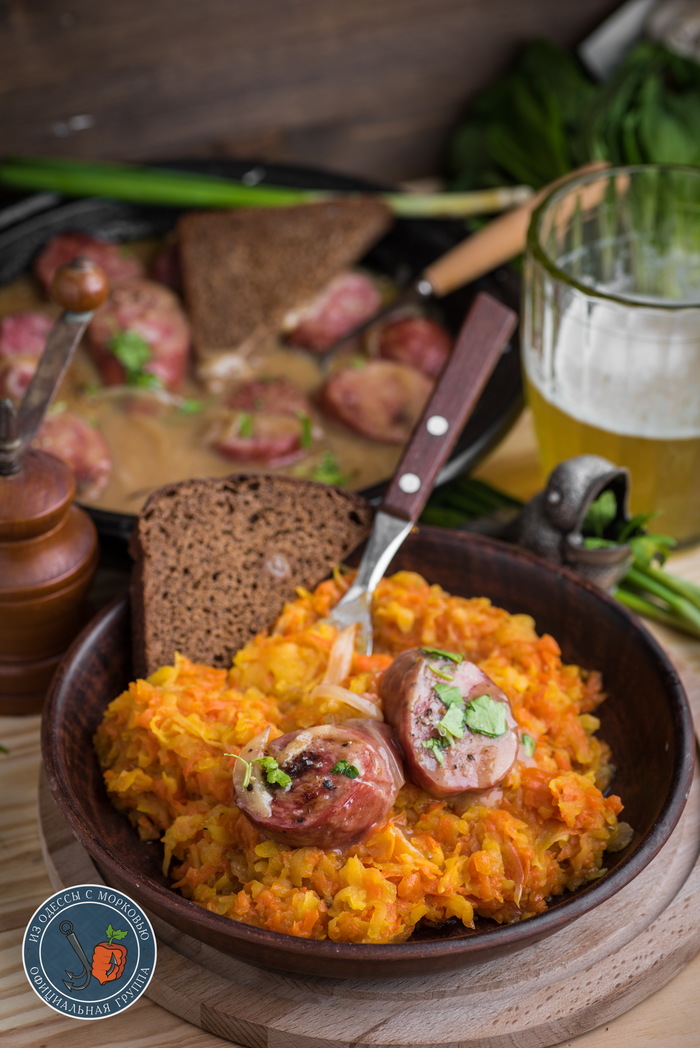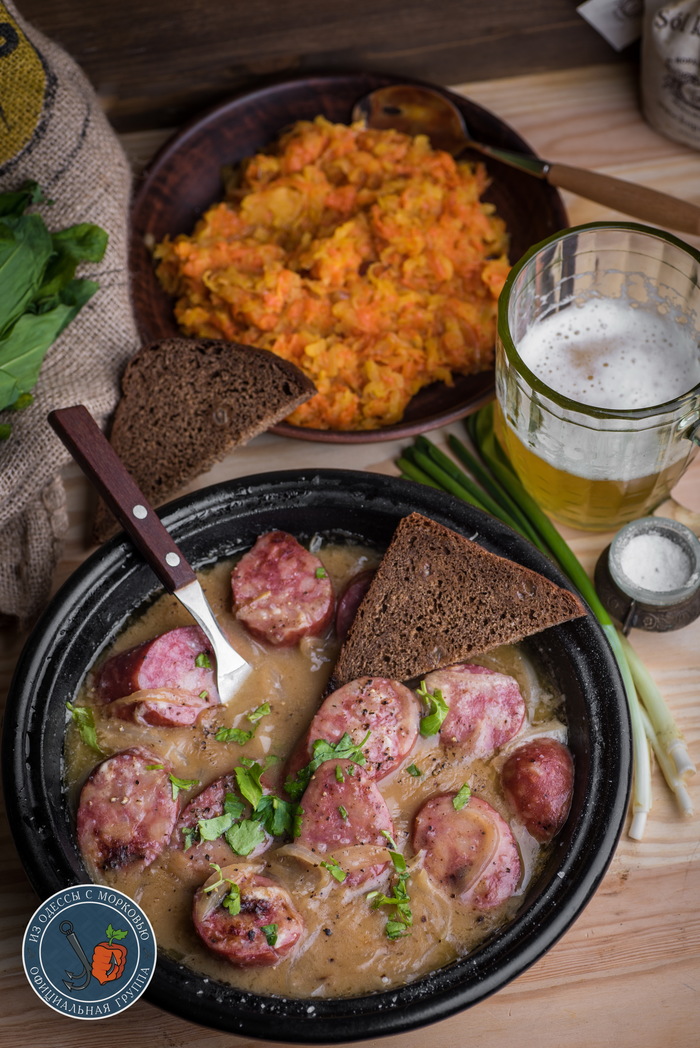 - UPD: если захотите более родного сочетания колбасы с гарниром, рекомендуется вместо предложенного гарнира приготовить тушеной капусты. Свежей или кислой.