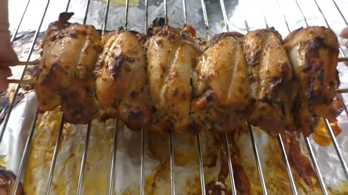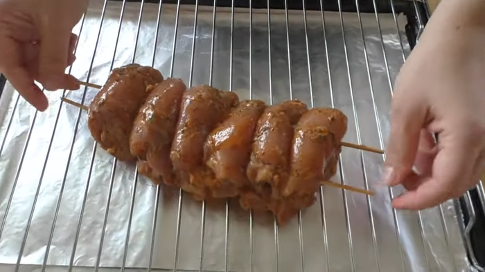 Используя деревянные шпажки (предварительно замочила в воде), складываем бедра пополам и аккуратно нанизываем. Собираем конструкцию для запекания, лист застеленный фольгой, а сверху решетка.