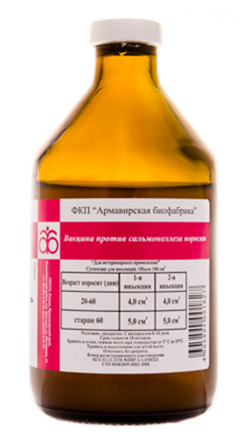 Вакцина предназначена для профилактики сальмонеллеза свиней в неблагополучных и угрожаемых по болезни хозяйствах.