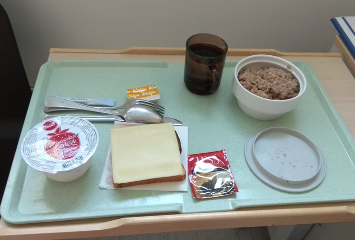 Потом был ужин. Вообще в правилах написано, что поступившие после 13 часов могут на ужин не рассчитывать, но там как-то договорились. Не сказать, что я была в восторге от еды, но и тошноты она не вызывала. Запаренные гречневые хлопья, пара бутеров с сыром, чай и клубничный йогурт.