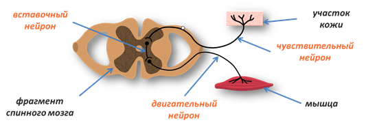 Рефлекторная дуга соматического отдела нервной системы состоит из трёх нейронов. Проследим прохождение нервного импульса.
