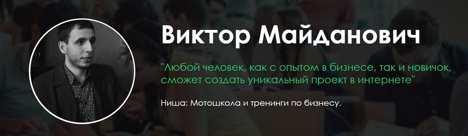 Что касается квалификации, то выбор для бизнеса Майданович сделал не по призванию, но, скорее всего, просто "занимая свою нишу". Виктор Майданович прошёл большое количество различных курсов и тренингов. В том числе учился и у известного киевского "инфоцыгана" Олеся Тимофеева. На своих семинарах Тимофеев учит, что если человек сделает (да что угодно) пятьсот раз, то он автоматически становится в этом деле профессионалом. И не нужно ждать профессионального роста, поскольку времени мало, а просто начать учить кого-нибудь другого. И за время обучения других ты и сам в конце концов возрастёшь профессионально. И Майданович, похоже, согласен со своими учителем (далеко не единственным).