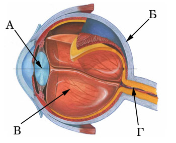 12. Какой буквой на рисунке обозначен зрительный нерв?