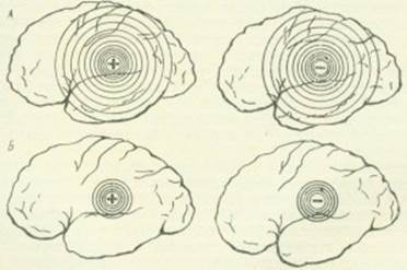 Некоторые явления, связанные с динамикой нервных процессов, получили названия законов индукции. Так, на периферии очага одного процесса всегда возникает процесс с противоположным знаком (рис. 4.1). Если в одном участке коры сконцентрирован процесс возбуждения, то вокруг него индуктивно возникает процесс торможения. Чем интенсивнее очаг возбуждения, гем интенсивнее и шире распространен вокруг него процесс торможения.