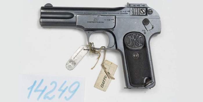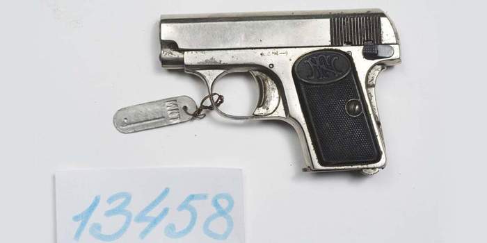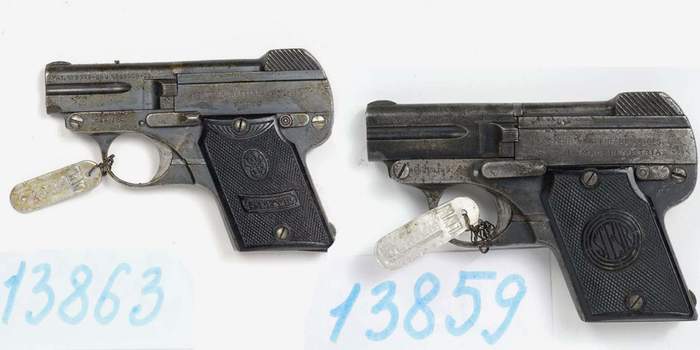 И снова видим на рукоятке уже знакомые буквы FN. Нет, трудности музейщиков понятны: конечно, никелировка скрыла все прочие буквы. Конечно, малыша Browning M1906 калибра 6,35 мм не узнать трудно, но всё же, как мы видим, можно. И даже спутать его с пистолетом Frommer Liliput. А вот откуда взялся 1959 год — тайна сия велика есть.