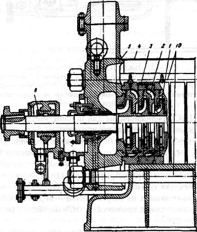Секции насоса зажаты между всасывающей и нагнетательной крышками, которые стягиваются шпильками. Стыки секций уплотняются за счет контакта из уплотняющихся поясков и дополнительно за счет резиновых уплотнительных колец.