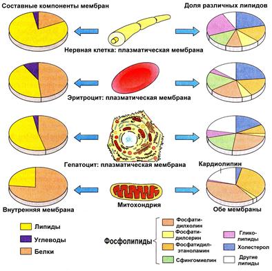 Рис.18.1. Сравнительный химический состав плазматической мембраны нейронов, эритроцитов, гепатоцитов и митохондрий