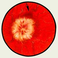При воздействии патологического процесса на периферический нейрон зрительного пути атрофия зрительного нерва и связанное с ней резкое понижение остроты зрения наблюдаются чаще и развиваются быстрее, чем при не осложненном застойном диске. Застойный диск при абсцессах головного мозга возникает также вследствие повышения внутричерепного давления и большей частью выражен слабее, чем при опухоли. Характерны быстрое развитие отека диска зрительного нерва и кровоизлияния.