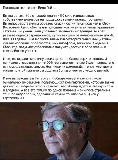 Ах, вакцина… Но дело в том, что главный мировой персонаж по части вакцин — это Билл Гейтс. Он уже лет пятнадцать как отошел от информационных технологий, вместо этого финансируя разработку каких угодно вакцин (этим занят фонд имени Билла и его жены Мелинды). Для всех на планете.